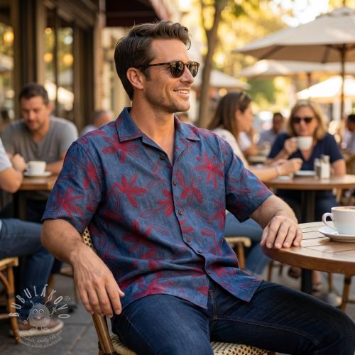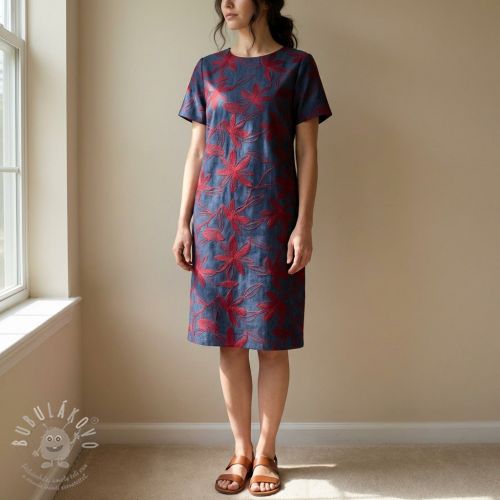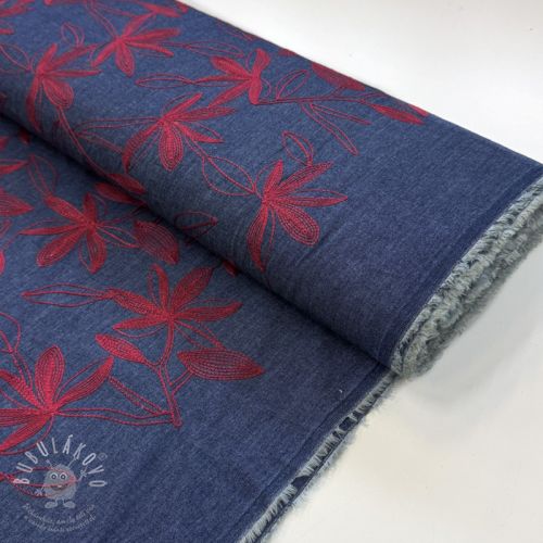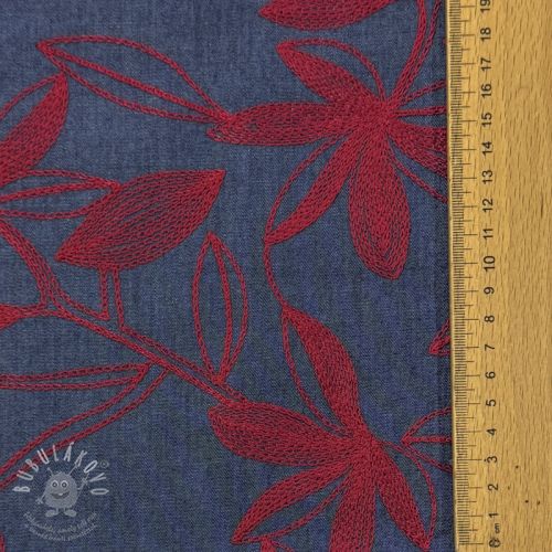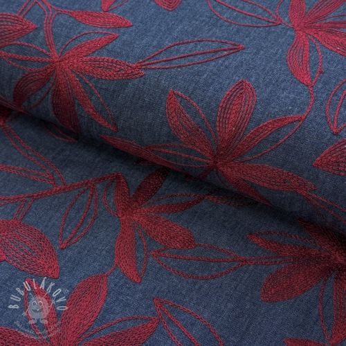 Bavlněná látka JEANS Embroidery Flowers burgundy