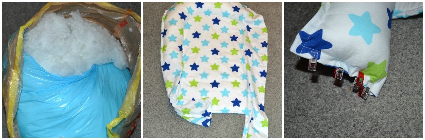 Hniezdo naplníme polystyrénovým rúnom výplňou. Použite 750gr až 1kg podľa toho ako to chcete mať pevné. Pri krajoch si to vyplníme slabšie aby sa nám okraj dal dobre zašiť. Okraje prešijeme na stroji (pozor, časť kde je šnúrka nezašívame – mne ju nevidno, lebo som až neskôr navliekala, ale lepšie je šnúrku navliekať pred naplnením výplňou).