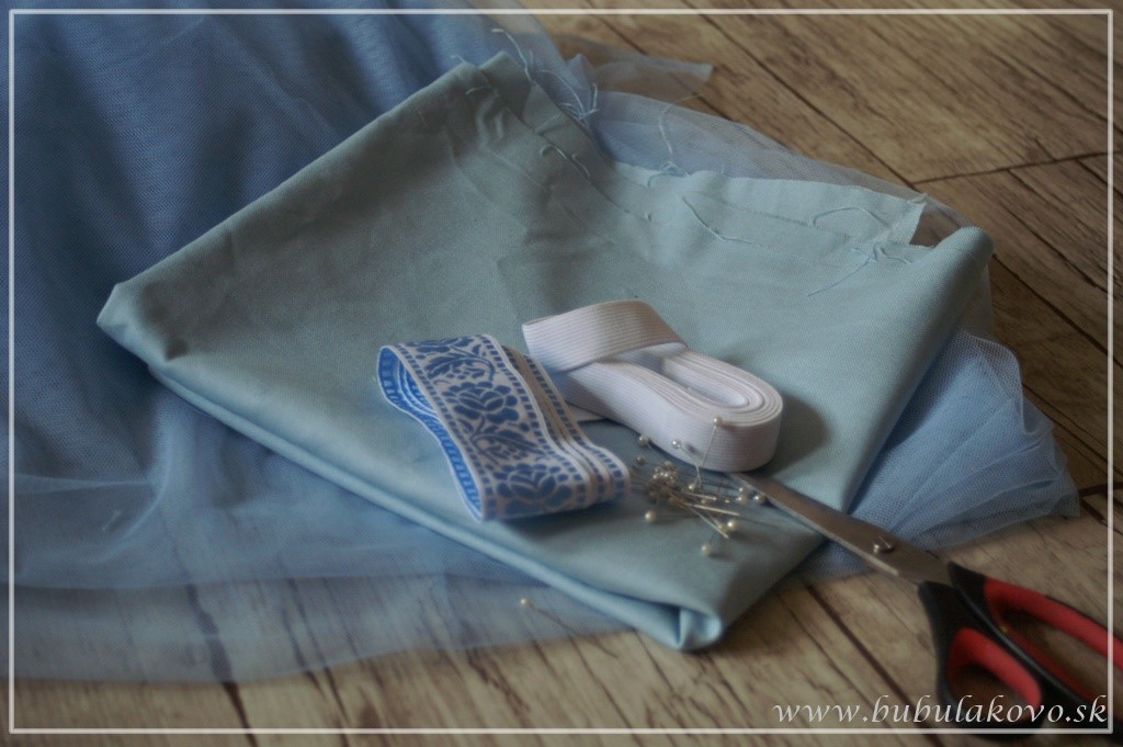 4. Tyl si nastriháme na rovnakú dĺžku, no šírka bude o pár centimetrov dlhšia než dĺžka bavlnenej spodničky. Na takto nastrihaných pásoch látky vytvoríme menšie sklady (na každej vrstve samostatne). Pomáhame si upevňovaním každého záhybu špendlíkmi a celú tylovú časť po vrchnej strane prešijeme.